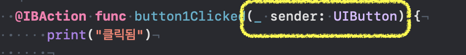 IBAction์ผ๋ก ์ฐ๊ฒฐํ ๋ถ๋ถ์ ์ ๋ณด๋ฉด, ๋งค๊ฐ๋ณ์ ๋ถ๋ถ์ (_ Sender: UIButton)๋ผ๊ณ ์์ต๋๋ค.