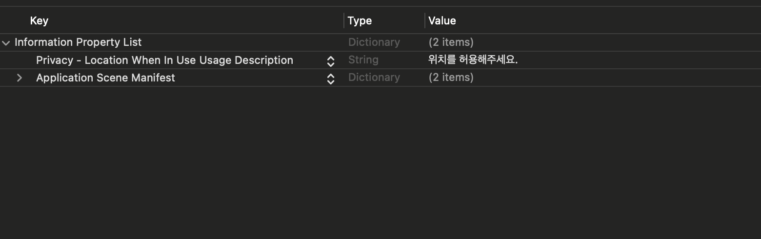 โ ๏ธ ์์น ์๋น์ค์ ๋ํ ์น์ธ ์์ฒญ ๋ฉ์๋๋ ์์์ ์ธ๊ธํ๋ info.plist์ ๊ฐ์ ํญ๋ชฉ์ด ์ถ๊ฐ๋์ด ์์ด์ผ ์ฌ์ฉํ ์ ์์ โ ๏ธ