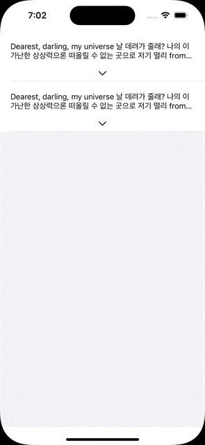 cell.descriptionLabel.text = "Dearest, darling, my universe ๋ ๋ฐ๋ ค๊ฐ ์ค๋? ๋์ ์ด ๊ฐ๋ํ ์์๋ ฅ์ผ๋ก ๋ ์ฌ๋ฆด ์ ์๋ ๊ณณ์ผ๋ก ์ ๊ธฐ ๋ฉ๋ฆฌ from Earth to Mars ๊ผญ ๊ฐ์ด ๊ฐ์ค๋? ๊ทธ๊ณณ์ด ์ด๋๋ ์ค๋ ์ธ๋ก์, ๊ทธ ๋ฐ๋๋ง์ ์ฐพ์์ ์ด๋ค ์ค์๋ก ์ดํ ๋ก ์ฐ๋ฆฌ๋ ํจ๊ป์ผ๊น? ์ธ์์๊ฒ์ ๋๋ง์ณ run on ๋์ ์ ๋๊น์ง ๊ฐ์ค my lover ๋์ ๊ฒฐ๋ง์ผ๊น? ๊ธธ ์์ ์ฐ๋ฆฌ ๋ mm ๋ถ์์ง๋๋ก ๋๋ฅผ ๊ผญ ์์ ๋ ์ฌ๋ํ ๋ด๊ฒ ์