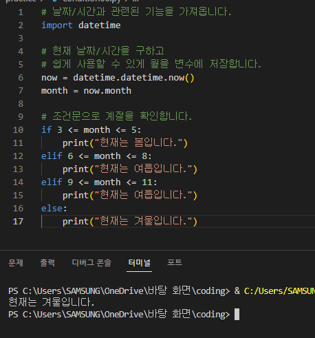 ์์ ์ฝ๋๋ฅผ ์์ฑํ ์๊ฐ์ด '1์ 29์ผ'์ด๋ฏ๋ก "ํ์ฌ๋ ๊ฒจ์ธ์ ๋๋ค."๊ฐ ์ถ๋ ฅ๋ ๊ฒ์ด๋ค.