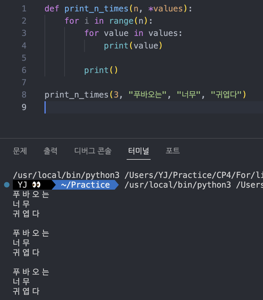 ๋ง์ฝ print_n_times("ํธ๋ฐ์ค๋", "๋๋ฌด", "๊ท์ฝ๋ค", 3)์ฒ๋ผ ๋ง ์ฌ์ฉํ ์ ์์๋ค๋ฉด??