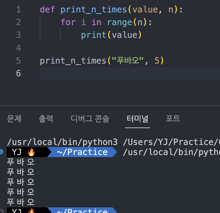 → 'print_n_times'๋ผ๋ ํจ์๋ฅผ ์์ฑํ๊ณ , 'value'์'n'์ด๋ผ๋ ์๋ณ์๋ฅผ ์ ๋ ฅํจ