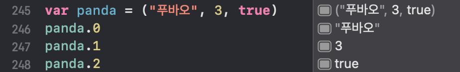 panda.0 = "μμ΄λ°μ€" → panda = ("μμ΄λ°μ€, 3, true)