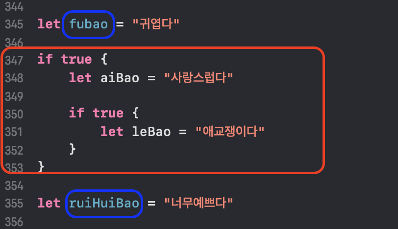 ๋นจ๊ฐ์์ผ๋ก ํ์ํด ๋์ ๋ถ๋ถ์ด ๋ฐ๋ก ๋ก์ปฌ ์ค์ฝฅ(Local Scope)์ด๋ค.