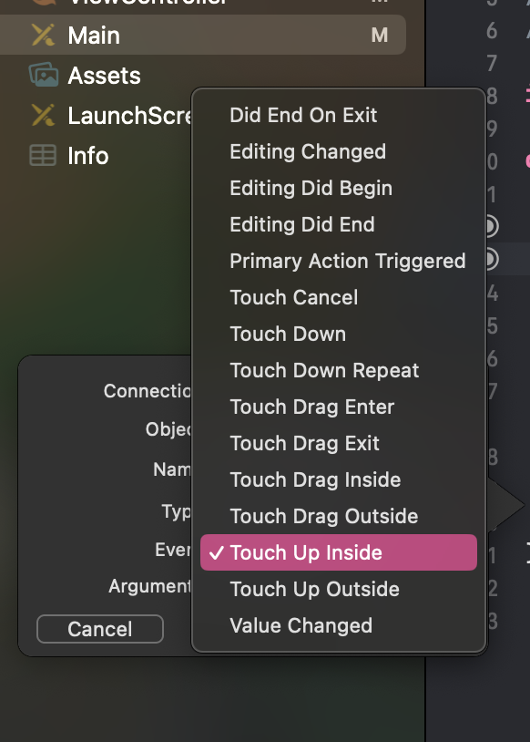 ์ฐ์ , ์ปค์๋ฅผ ์์ชฝ์ ๋๊ณ ํด๋ฆญ์ ํ๋ค๊ฐ ๋์ ๋, ๋ฐ์ํ๋ 'Touch Up Inside'๋ก ์ค์ ํ๊ณ