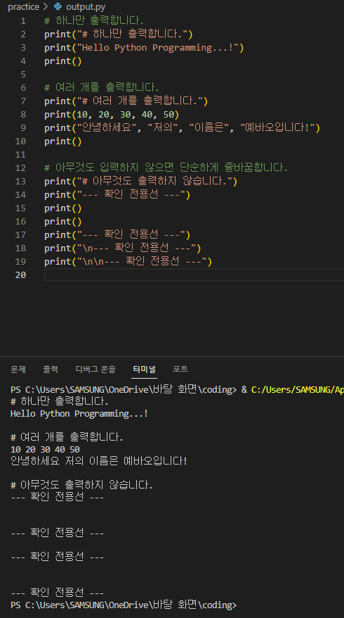 ์๋๋ ์ฃผ์, ์ถ๋ ฅ(ํ๋๋ง ์ถ๋ ฅ, ์ฌ๋ฌ ๊ฐ ์ถ๋ ฅ), ์ค๋ฐ๊ฟ์ ์ฌ์ฉํ์ฌ ์ถ๋ ฅํ ๊ฒฐ๊ณผ๋ฌผ์ด๋ค.