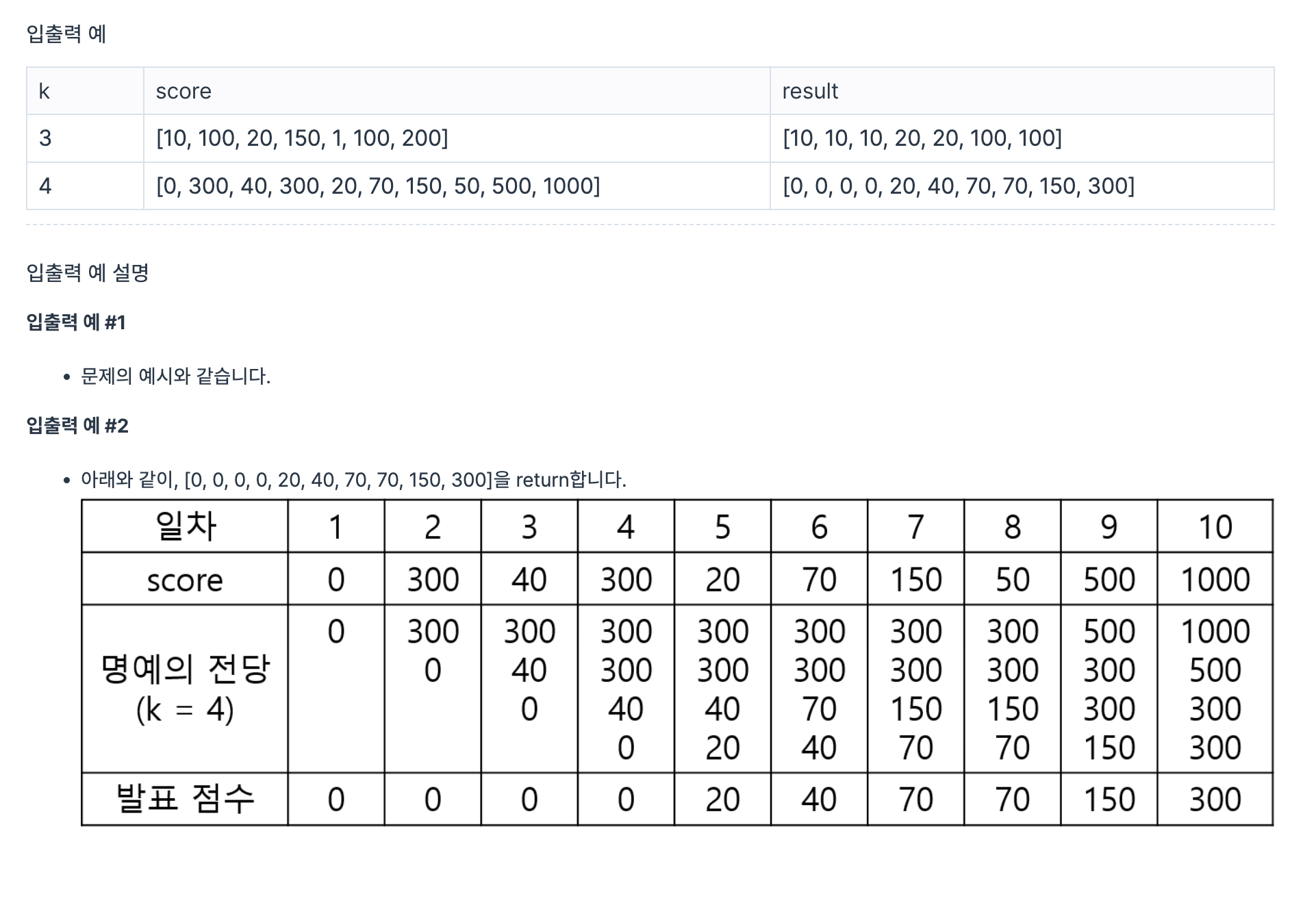 ์ ์๋ฅผ for ๋ฌธ์ผ๋ก ๋๋ ค์ hallOfFame์ ๋ฃ์ด์ฃผ๊ณ , ๋ด๋ฆผ์ฐจ์์ผ๋ก ์ ๋ ฌํด์ฃผ์๋ค.