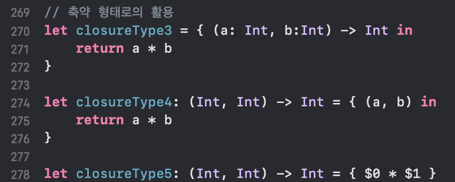 - ํด๋ก์ ์์ ๋งค๊ฐ๋ณ์๋ { } ์์ ๋์ดํ๋ค.