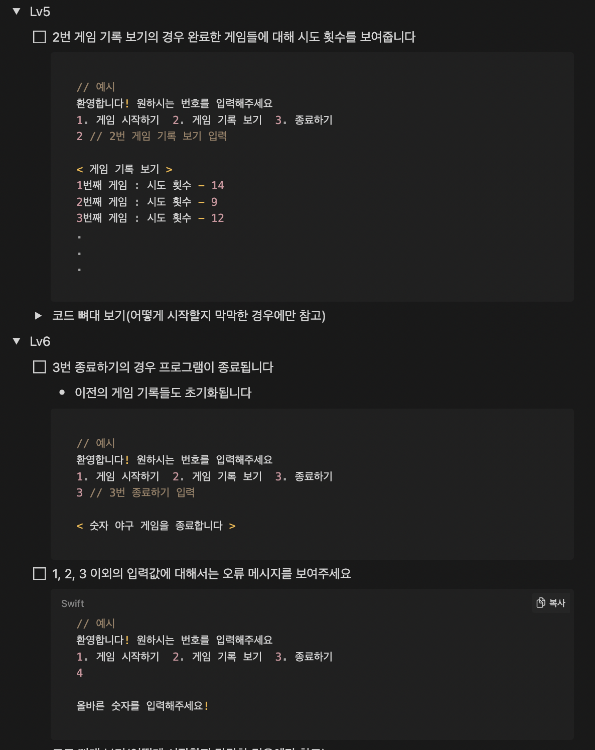 3์ฃผ์ฐจ_Swift ๋ฌธ๋ฒ ์ข ํฉ๋ฐ ์ฌํ_๊ฐ์ธ๊ณผ์ _์ผ๊ตฌ๊ฒ์๋ง๋ค๊ธฐ(Lv3~6) (0) | 2024.03.17 |