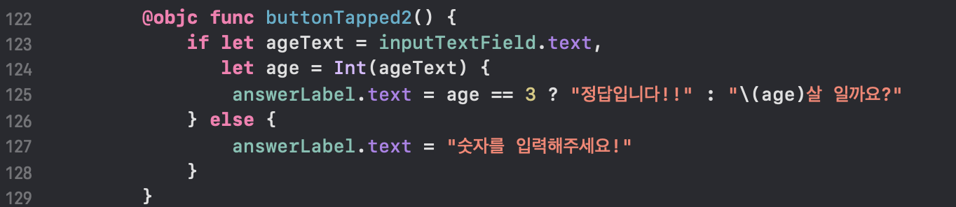 ๊ทธ๋ฐ ํ, buttonTapped()๋ผ๋ ์ค๋ธ์ ํจ์๋ฅผ ๋ง๋ค์ด์ฃผ๊ณ ,