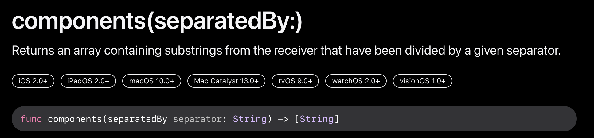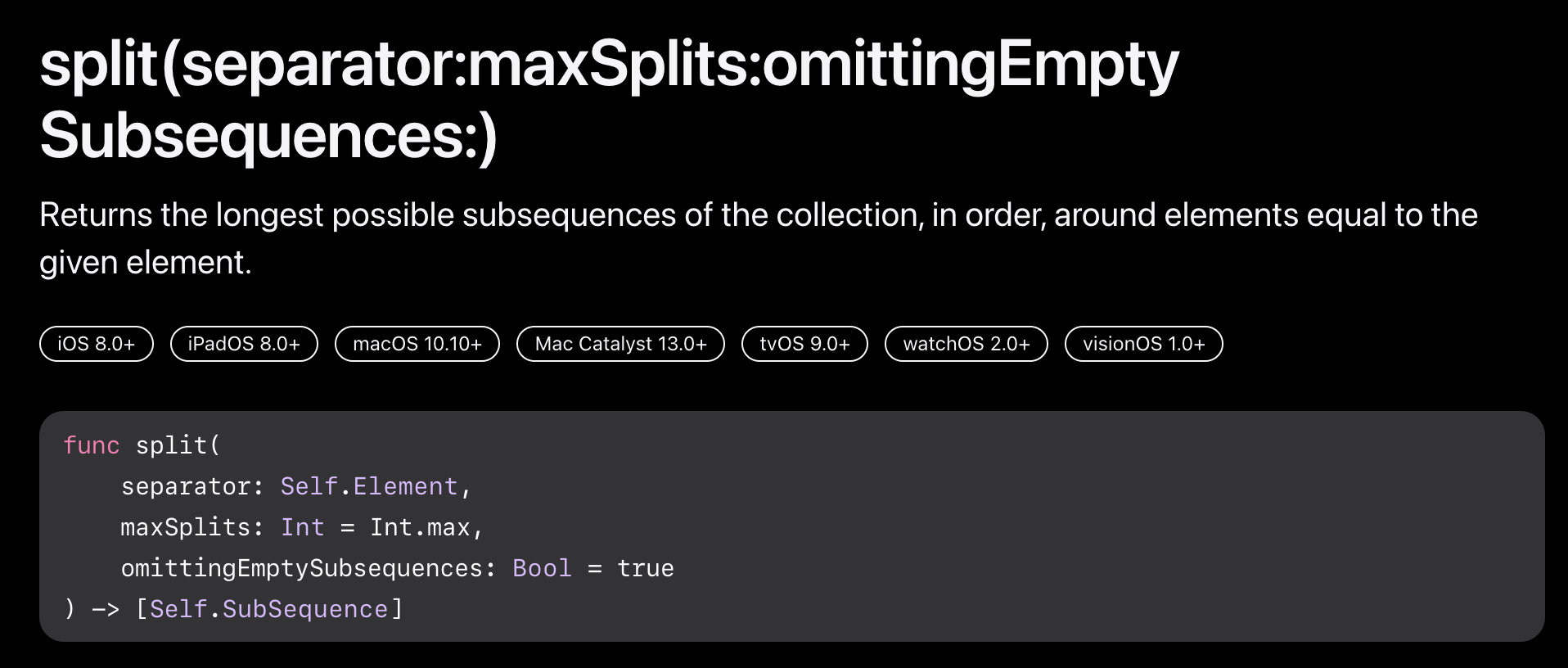 split : 'separator’, ‘maxSplits’, ‘omittingEmptySubsequences’