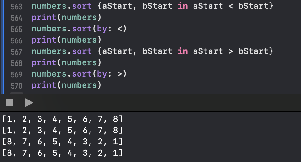 numbers.sort(by: <) ์ด๋ ๊ฒ ์จ๋ ๋๋ค.