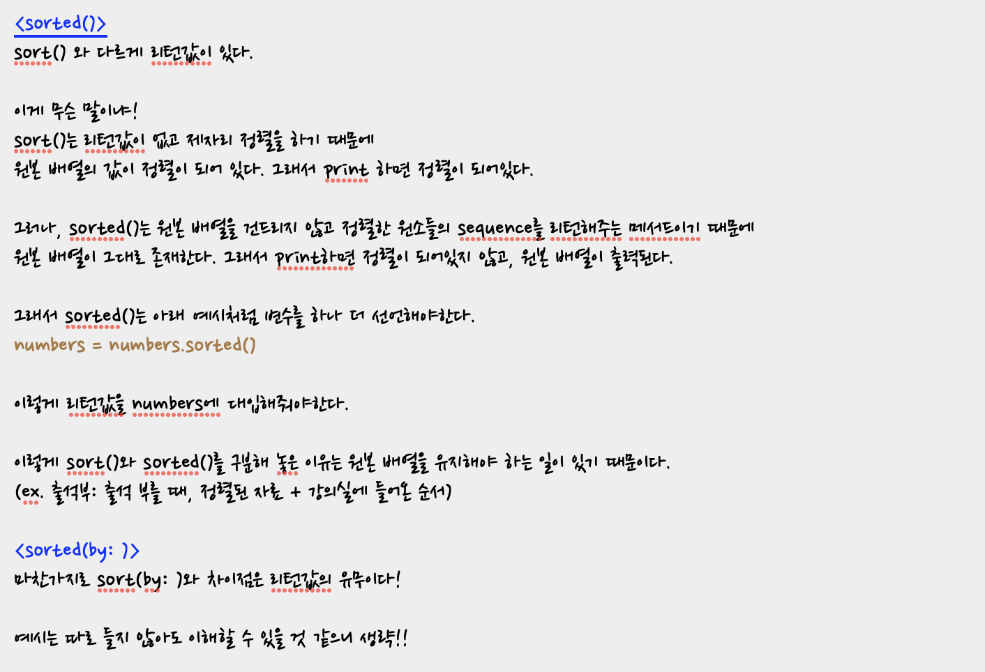 ๊ทธ๋ฌ๋, sorted()๋ ์๋ณธ ๋ฐฐ์ด์ ๊ฑด๋๋ฆฌ์ง ์๊ณ ์ ๋ ฌํ ์์๋ค์ sequence๋ฅผ ๋ฆฌํดํด์ฃผ๋ ๋ฉ์๋์ด๊ธฐ ๋๋ฌธ์!!