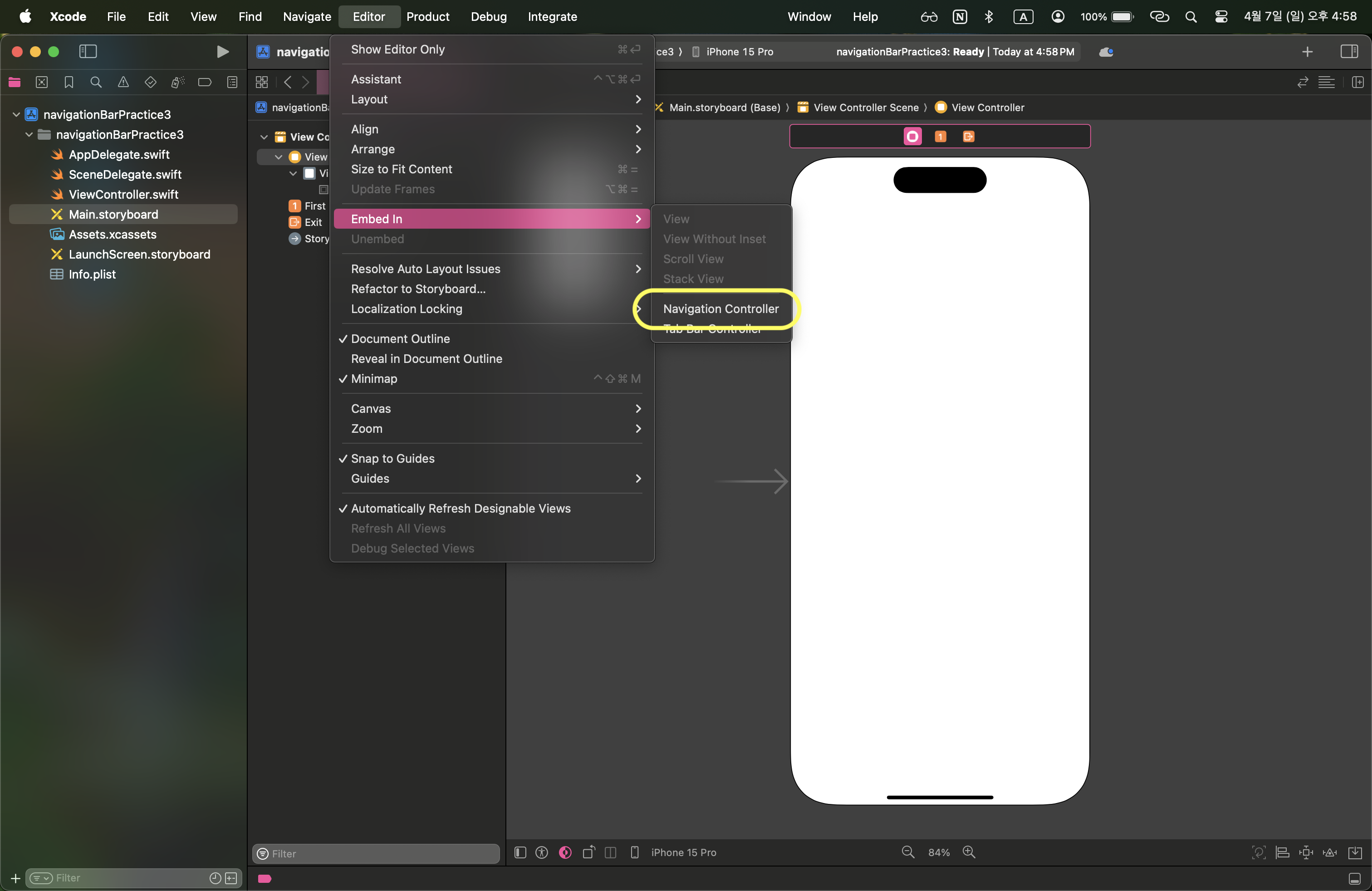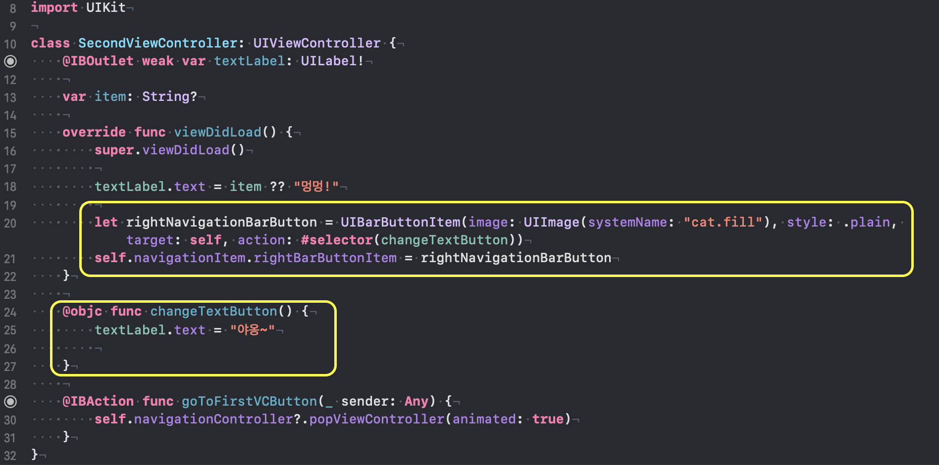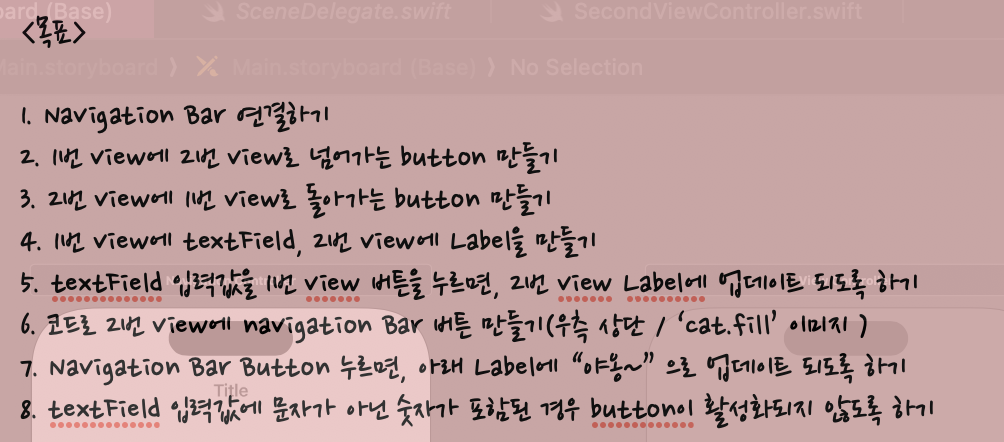 ⑦ Navigation Bar Button 누르면, 아래 Label에 “야옹~” 으로 업데이트 되도록 하기