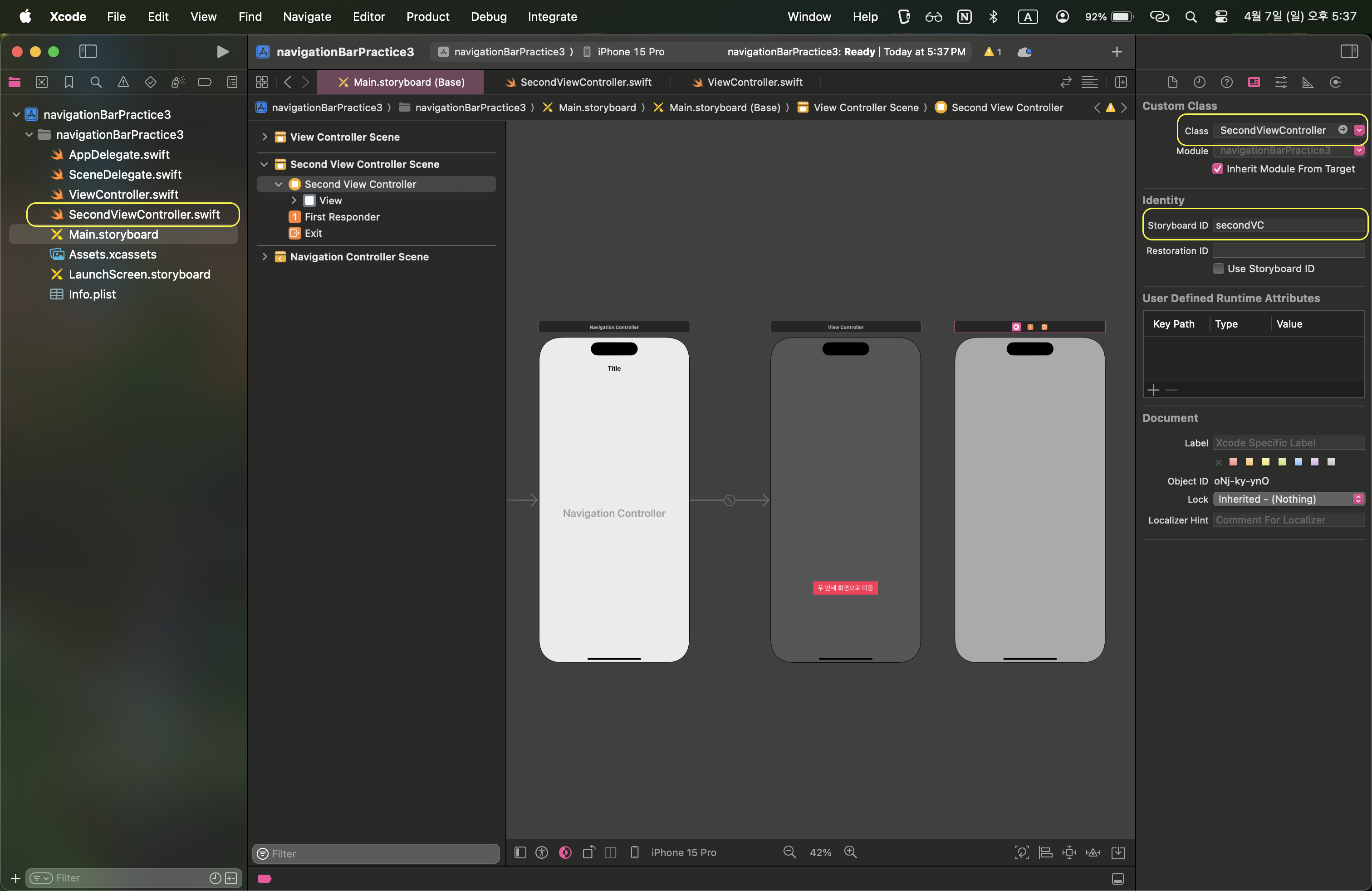 4. StoryBoard에 SecondViewController Class 연결하고, StoryBoard ID 넣어주기